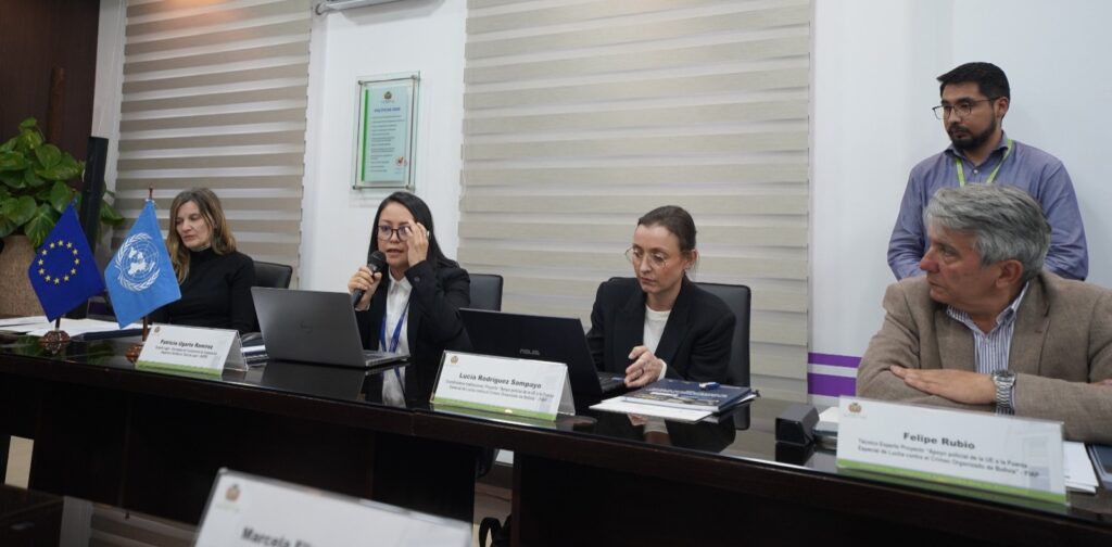 Del diálogo técnico participaron la Directora del Proyecto Apoyo Policial de la Unión Europea a la Fuerza Especial de Lucha Contra el Crimen Organizado de Bolivia, María Antonia Diez, la Experta Legal Encargada del Componente de Cooperación Regional y Asistencia Técnica Legal de la (UNODC), Patricia Ugarte Ramírez, coordinadores y técnicos de la FIAP, además de los Fiscales Superiores de Crimen Organizado, Luis Whaner Montaño, de Narcotráfico, Jorge Algarañaz, y Derechos Humanos, Marcela Eliana Terceros, y la Jefa de la Unidad de Asuntos Internacionales de la Fiscalía General del Estado María Luisa Herrera.