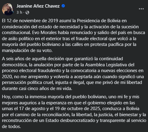 “A seis años de aquella decisión que garantizó la continuidad democrática, la anulación del proceso electoral fraudulento y la convocatoria a nuevas elecciones, no me arrepiento y volvería a aceptarla, aun cuando significó una persecución política cruel, injusta e ilegal”, escribió Añez en sus redes sociales.